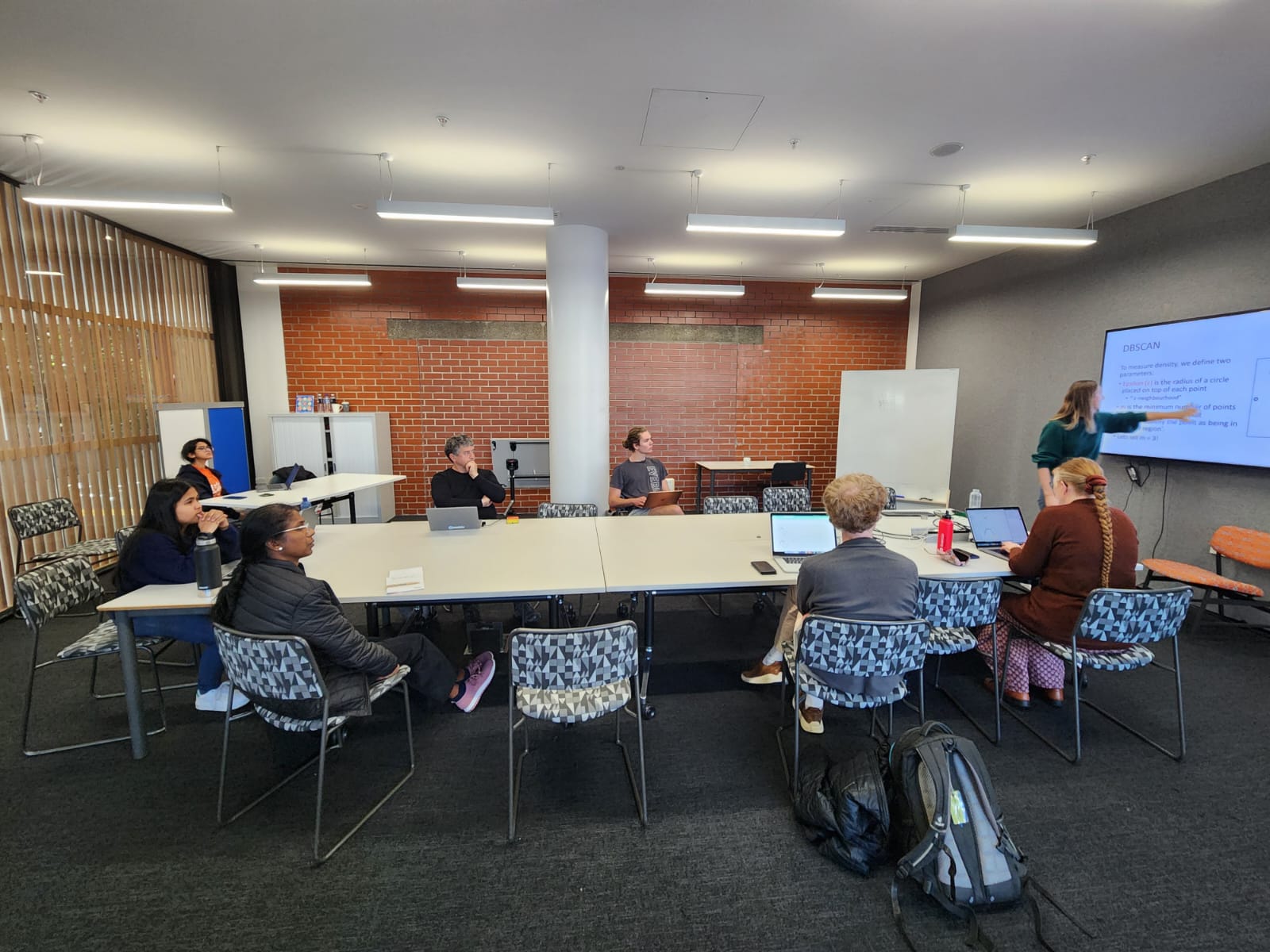 On September 9, 2025, SNAP held part two of the Learning AI workshop, led by Dr. Emily O’Riordan. Building on part one’s focus on supervised learning, this session began with a practical discussion of AI ethics in society and research, covering bias, consent, transparency, data, and reproducibility, before moving into unsupervised learning. Participants compared k-means and DBSCAN, observing how k-means suits roughly spherical clusters (and is sensitive to the choice of k) while DBSCAN can find arbitrarily shaped clusters and handle noise and outliers (with performance influenced by hyperparameters). They then applied principal component analysis (PCA) to reduce dimensionality, interpret explained variance to select components, and create clearer visualizations that can reduce noise. To conclude, attendees trained their first neural network using scikit-learn’s MLPClassifier to recognize handwritten digits! The workshop combined lecture-style content with interactive coding – the lectures and Python Jupyter notebooks are available here and here.